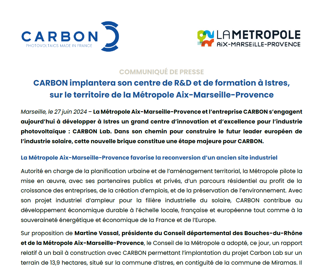 CARBON choisit Fos-sur-Mer, en région Sud, pour sa première giga-usine de photovoltaïque